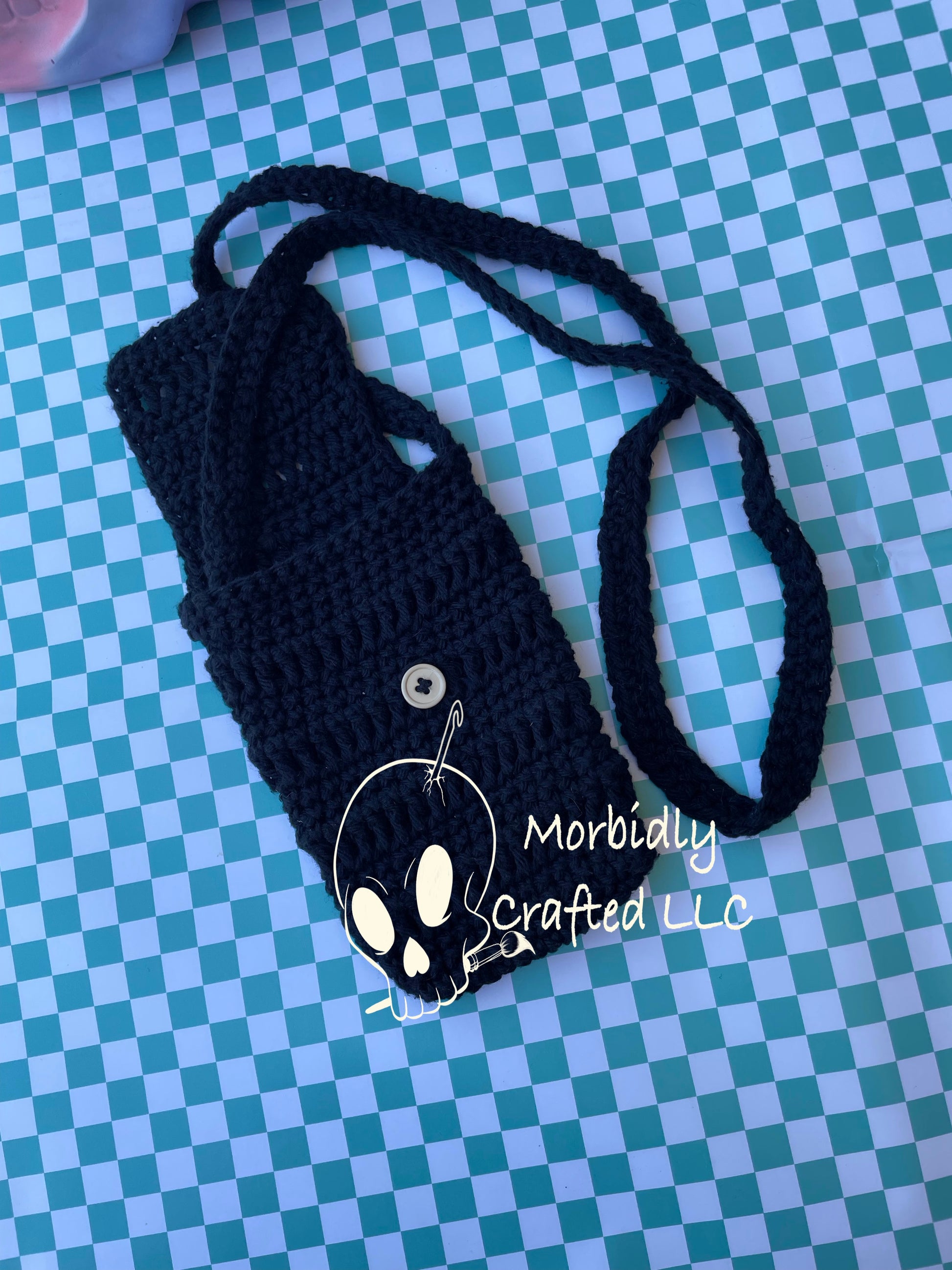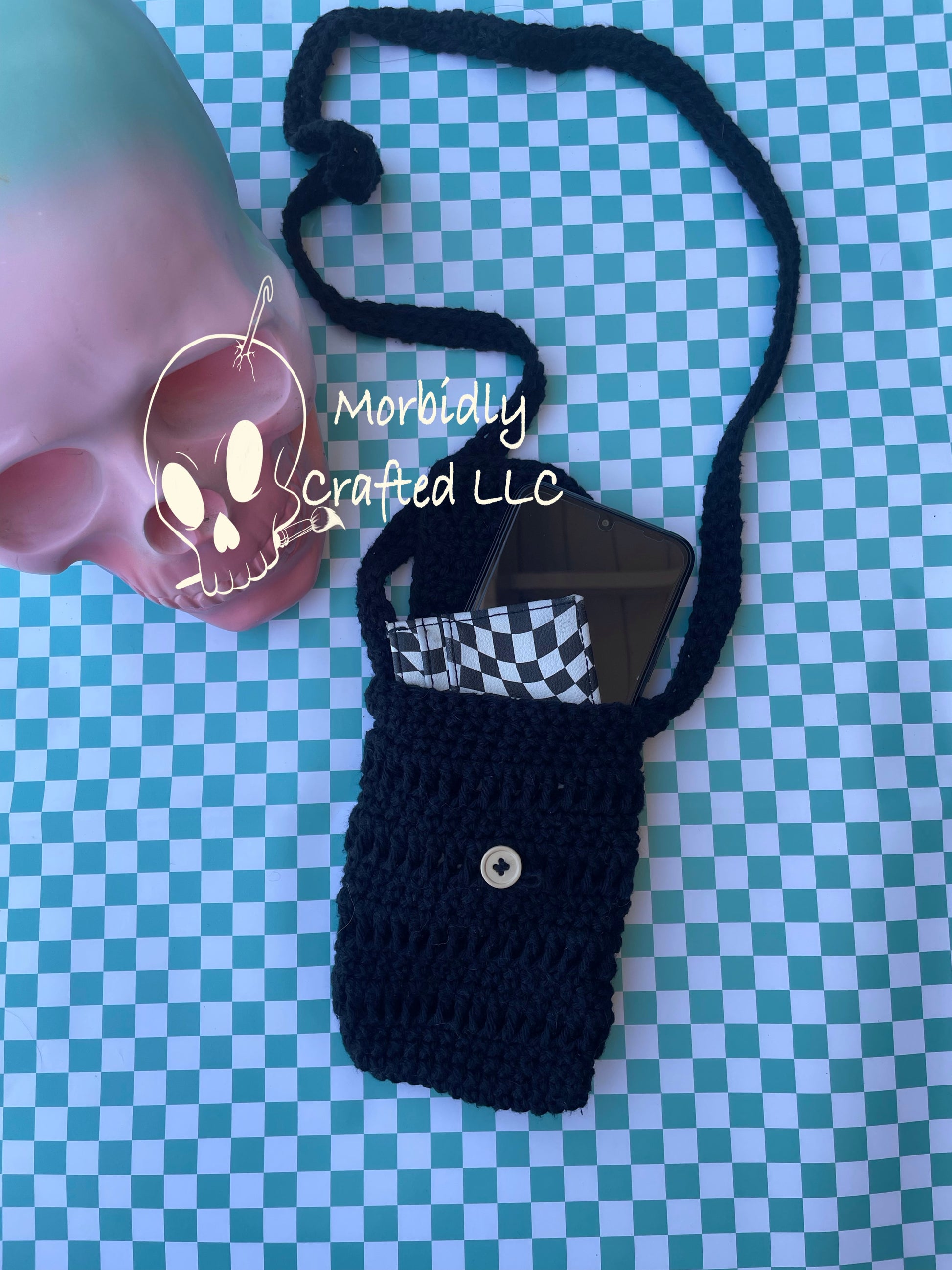 small bag fit phone and wallet, with closing flap and button, hand crocheted.
