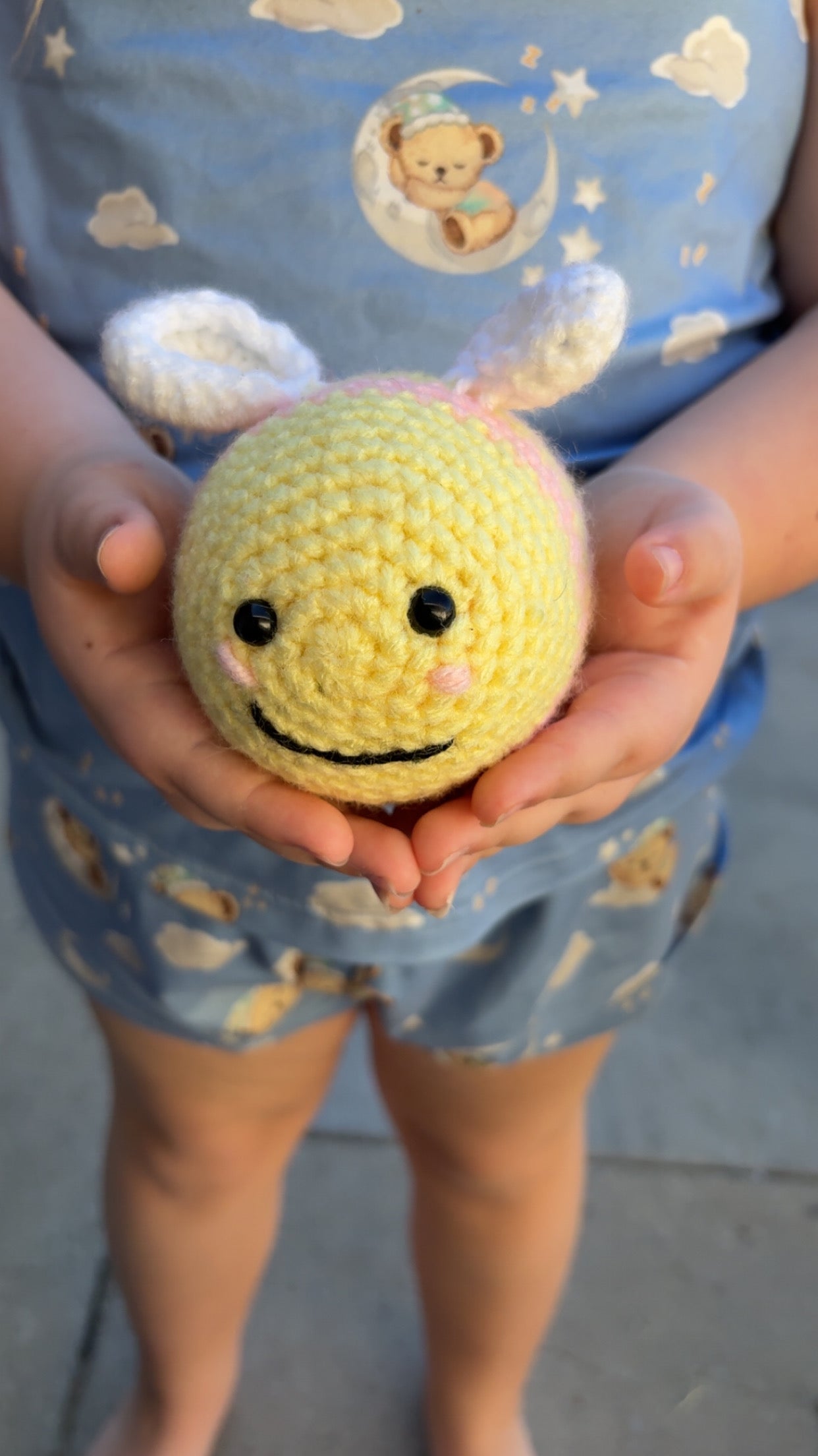 Handmade crochet plushy of a bee with cute Kawaii face, soft, yellow, and pink coloring