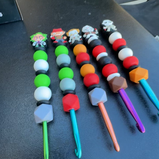 Level up your crafting with these unique, hand-assembled crochet hooks designed for comfort and style! Each hook features smooth, high-quality silicone beads and showcases iconic horror characters like Beetlejuice, Freddy Krueger, Jason Voorhees, Pennywise, and Michael Myers—perfect for makers who love a spooky aesthetic.