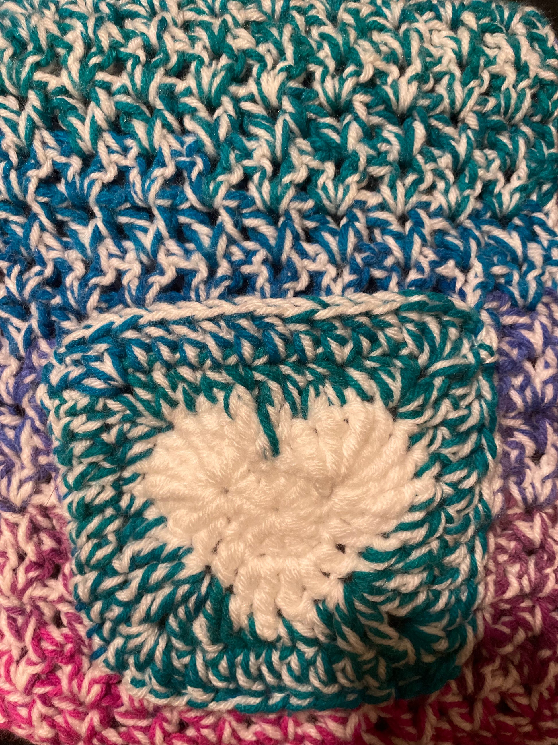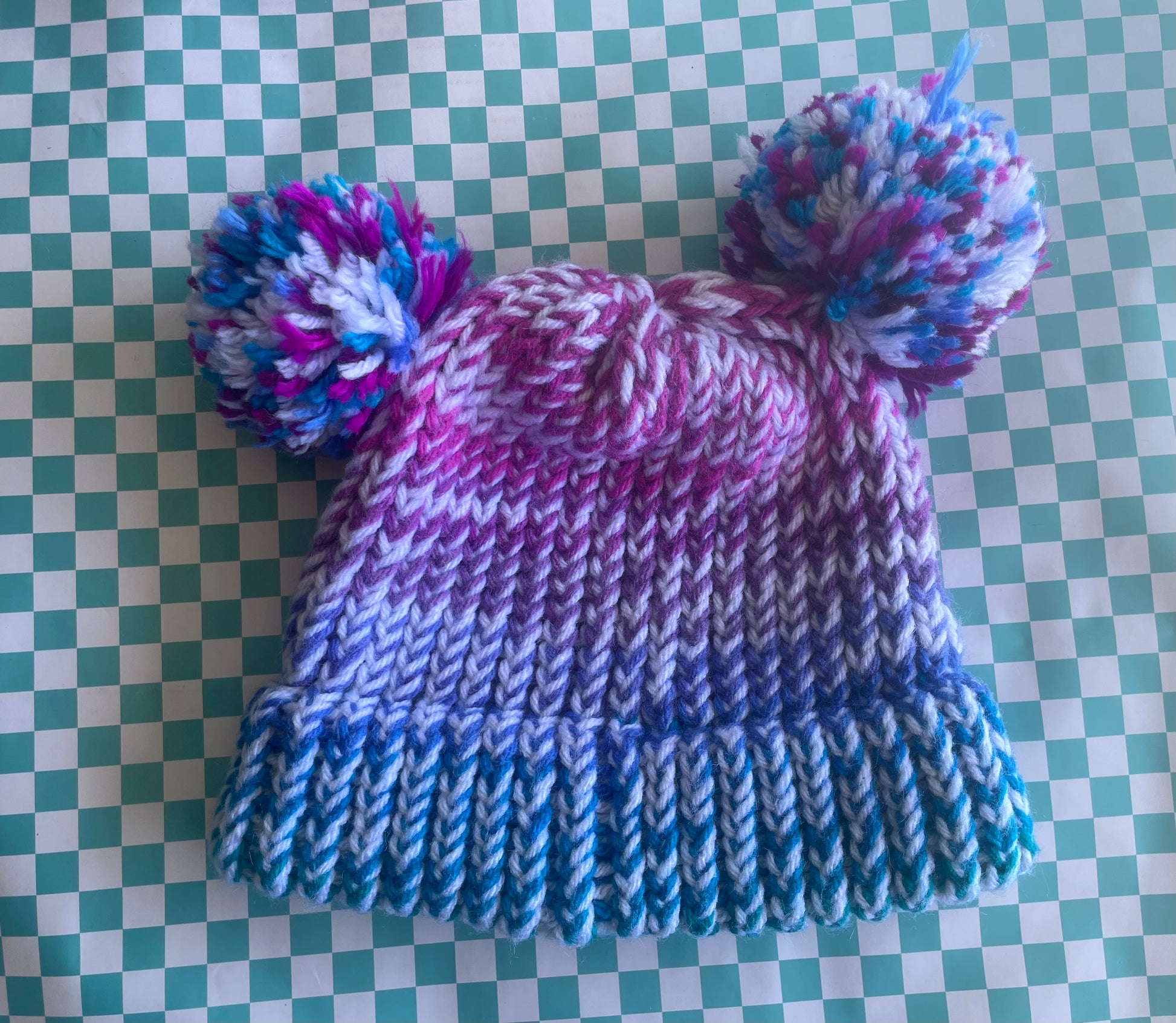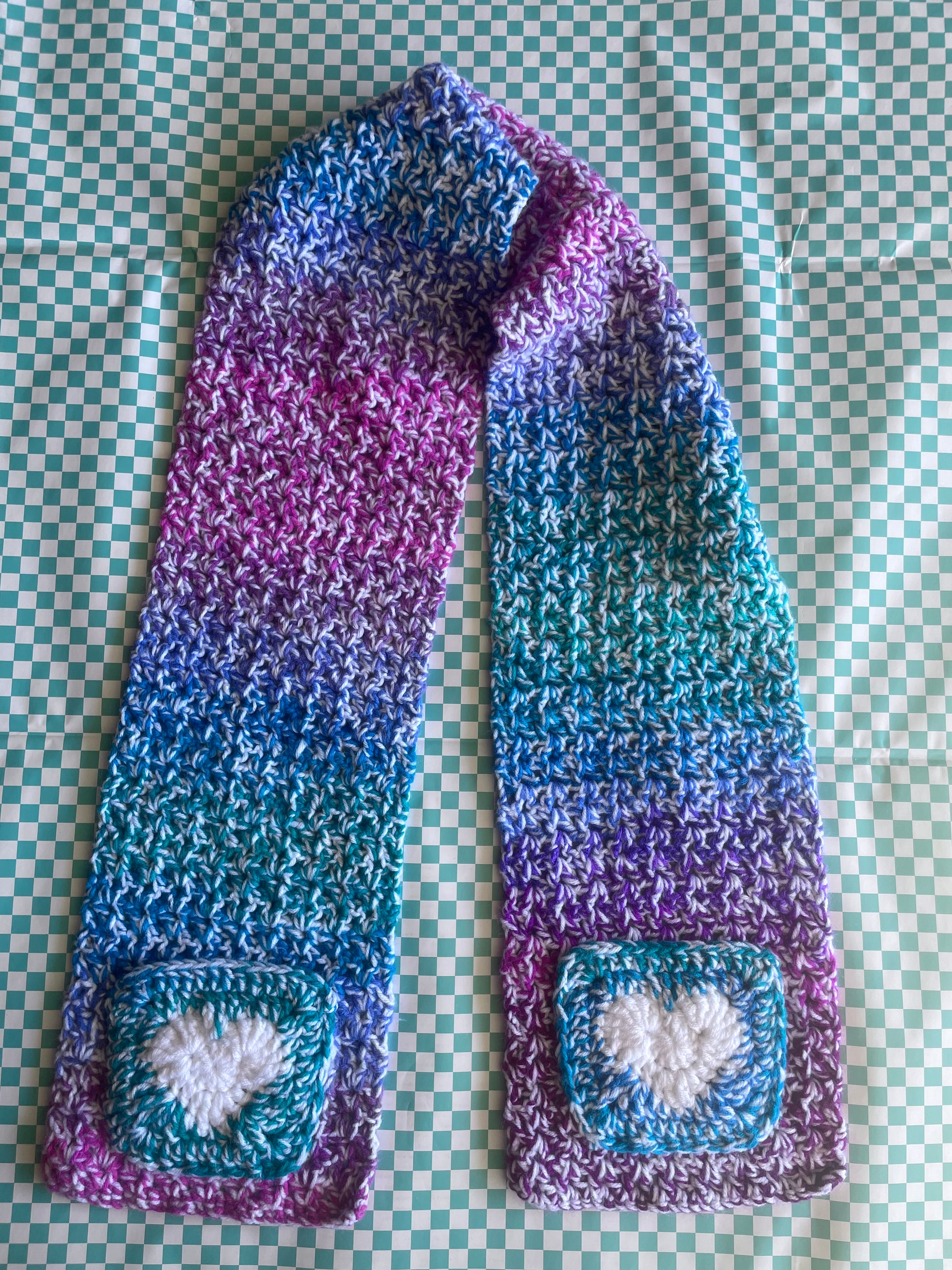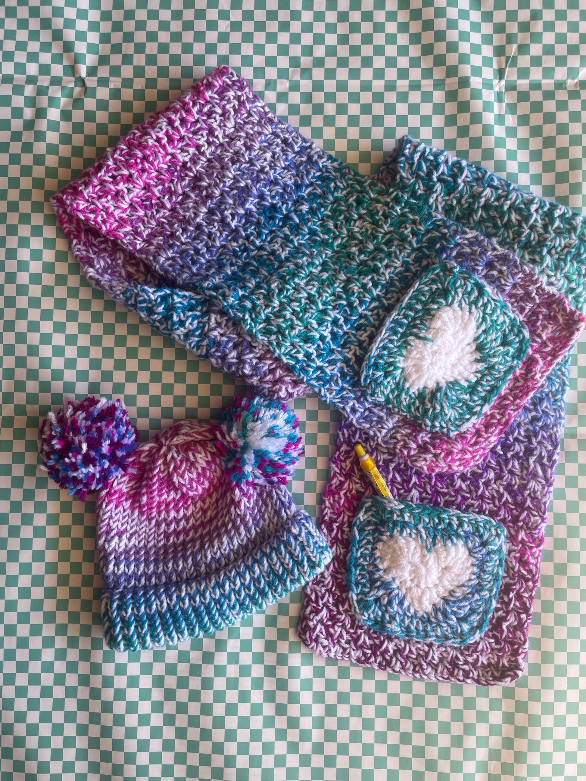 Handmade Double pom-pom knit beanie and V stitch crocheted scarf with heart pockets